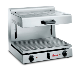 Главным преимуществом подобного оборудования является возможность придать готовому продукту румяную корочку. Данная модель имеет подвижный вертикальный нагревательный элемент, находящийся непосредственно над готовящимся продуктом, тем самым позволяя добиться запекания, а не жарки. Такое расположение идеально подходит для приготовления открытых горячих бутербродов, пицц, а также жюльенов. Большая решетка для приготовления (585х350 мм) позволяет вмещать достаточное количество продуктов.
