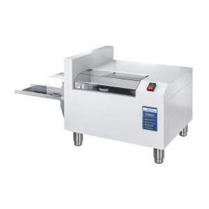 Шторка из нержавеющих пластин предотвращает доступ рук в зону нарезки хлеба со стороны приемного лотка.Корпус хлеборезки может быть изготовлен из нержавеющей или окрашенной стали.