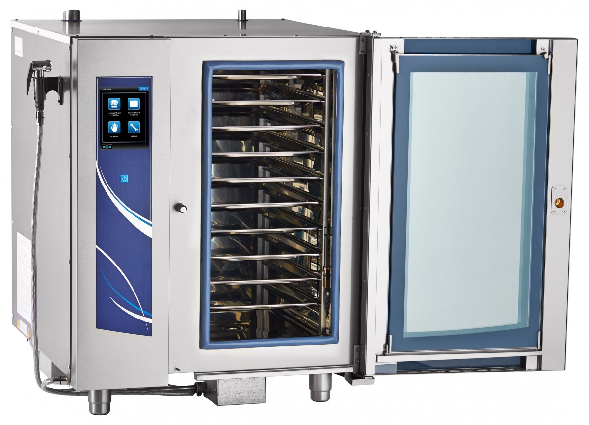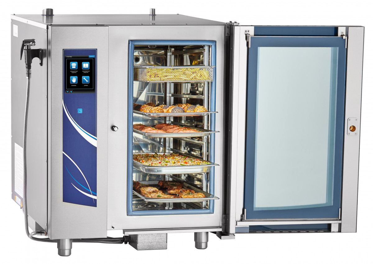 Управление устройством осуществляется с помощью современного электронного интерфейса, который включает удобную сенсорную панель с TFT-экраном. В пароконвектомате предусмотрено 120 предустановленных программ, а также возможность создания и сохранения до 360 индивидуальных рецептов, защищенных паролем. Каждая программа может включать до 4 этапов, что позволяет точно настраивать процесс приготовления, включая время и этапы ожидания.