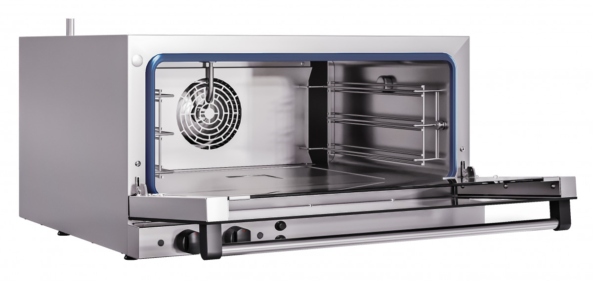 Внутренняя поверхность рабочей камеры выполнена из высококачественной нержавеющей стали AISI 304, что обеспечивает долговечность и легкость в уходе. Закругленные углы камеры способствуют простоте очистки. Дверца с двойным жаропрочным остеклением и воздушной прослойкой предотвращает возможность получения ожогов при эксплуатации.