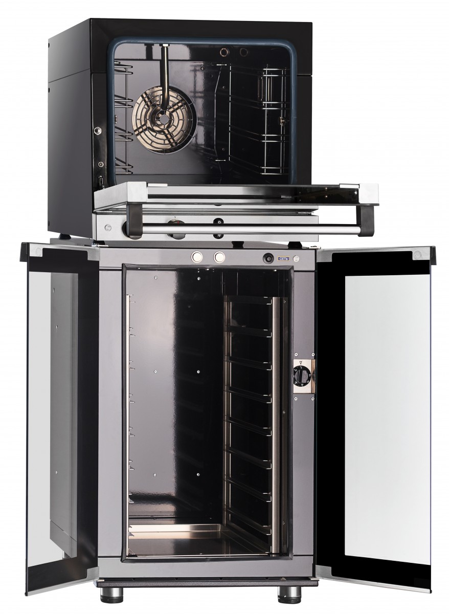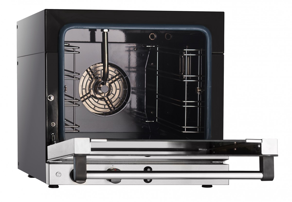 Корпус и внутренняя часть печи выполнены из прочного черного металла, который покрыт высококлассной эмалью, что гарантирует долговечность и легкость в уходе. Скругленные углы рабочей камеры способствуют простоте обслуживания. Печь оснащена функцией пароувлажнения, что позволяет улучшить качество выпечки.