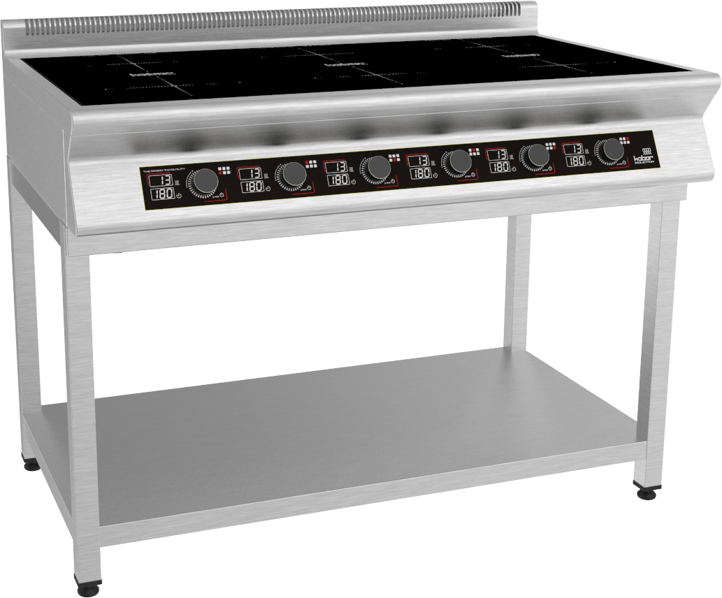 Плита индукционная на открытой подставке, 6 конфорок мощностью 6х3,5кВт, электронная панель управления с цифровой индикацией, 13 уровней нагрева, таймер до 180мин., съемный жировой фильтр, корпус из н.с. AISI 304, регулируемые по высоте ножки, рабочая поверхность - стеклокерамика 6мм, 21 кВт, 380В, вес 84 кг.