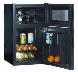 Термоэлектрический (без компрессора), винная секция: 8-18оС, 2 полки, вместимость 8 бутылок 0,75 л; секция для напитков: 3-4оС, объем 44 л, 2 полки; цвет черный