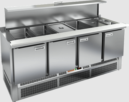 Устройство оснащено динамической системой охлаждения и автоматической оттайкой, что упрощает эксплуатацию. Электронная панель управления позволяет точно настраивать необходимые параметры. Стол имеет возможность размещения гастронормированных контейнеров, включая: