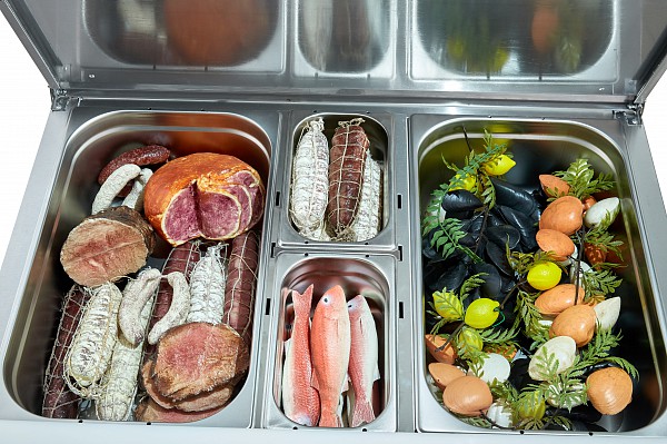 - Раздвижная двухсекционная крышка из нержавеющей стали защищает содержимое гастроемкостей и надежно фиксируется в открытом положении.