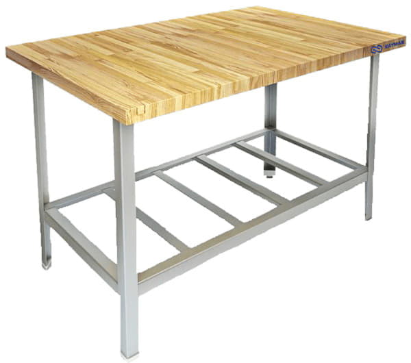 Стол предназначен для работы в кондитерских и мучных цехах. Стол имеет деревянную (бук) столешницу толщиной 40 мм и устойчивый разборный каркас из оцинкованного уголка толщиной 1.5 мм. Ножки стола снабжены регуляторами высоты, что позволяет устранять неровности пола.