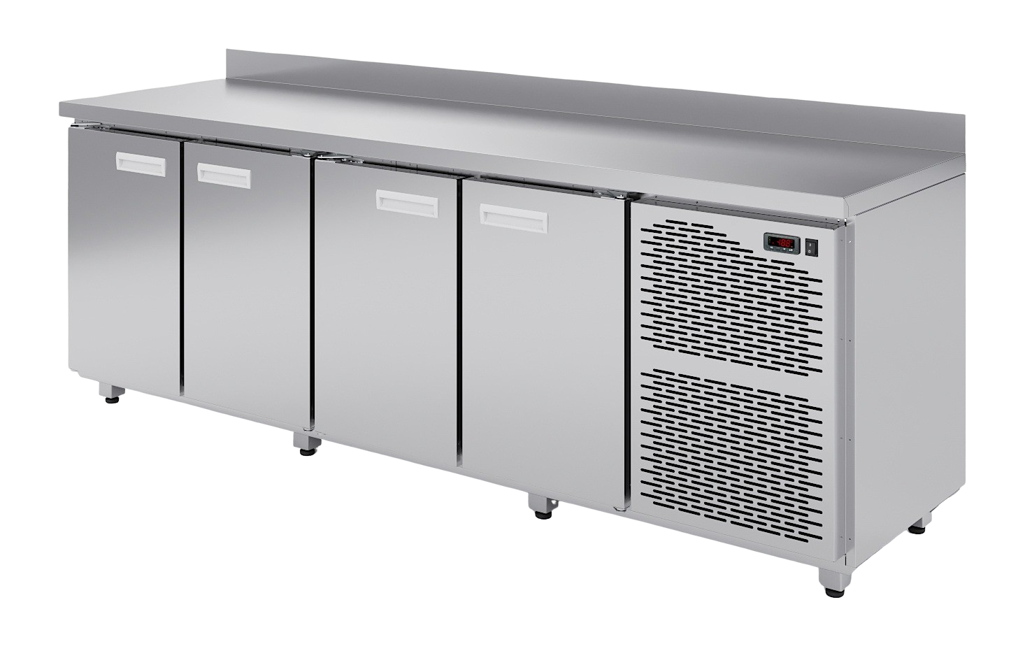 Стол также обладает динамической системой охлаждения и ТЭН для оттайки. Электронный терморегулятор обеспечивает точное поддержание заданной температуры. Внутри предусмотрено восемь полок для удобного размещения продуктов. Суточный расход электроэнергии составляет 9,0 кВт/ч.