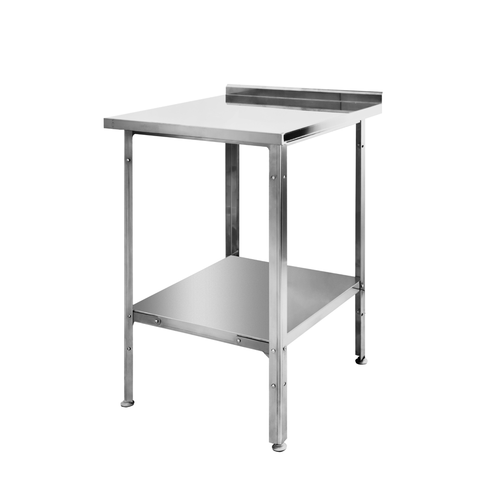 Стол имеет прямоугольную столешницу с бортиком, выполненную из высококачественной пищевой нержавеющей стали AISI 430. Внутренняя часть столешницы усилена древесно-стружечной плитой, что обеспечивает дополнительную прочность и предотвращает прогиб. Все края столешницы обработаны, что исключает риск травмирования персонала во время сборки, эксплуатации и санитарной обработки. Бортик позволяет устанавливать стол вдоль стены, предотвращая попадание остатков продуктов на пол и упрощая уборку.