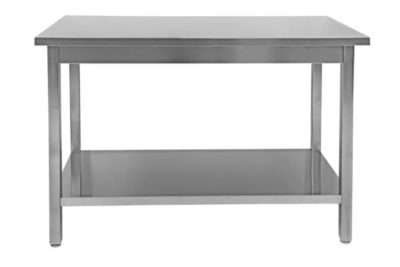 Стол имеет прямоугольную столешницу без борта, выполненную из пищевой нержавеющей стали AISI 430, которая дополнительно укреплена листом древесно-стружечной плиты с внутренней стороны. Это обеспечивает высокую прочность и предотвращает прогиб столешницы. Все кромки столешницы обработаны, что исключает риск травмирования персонала во время эксплуатации и санитарной обработки. Отсутствие борта позволяет устанавливать стол в любом месте и работать с любой стороны.