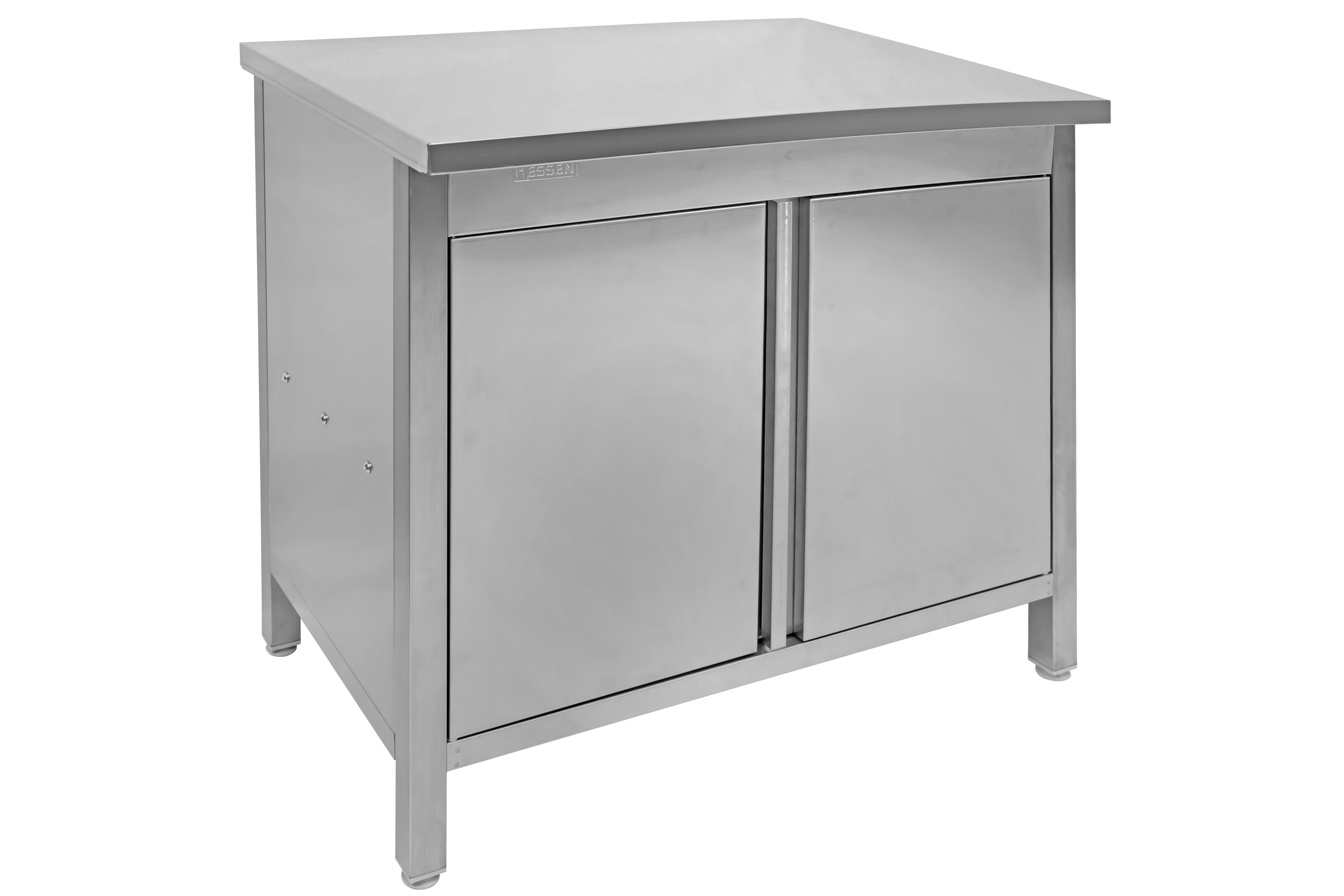Данная модель имеет закрытый тип конструкции с распашными дверцами и прямоугольной столешницей, выполненной из пищевой нержавеющей стали AISI 430. Столешница дополнительно укреплена древесно-стружечной плитой, что обеспечивает её прочность и предотвращает прогиб. Все края столешницы обработаны, а углы заварены и зашлифованы, что исключает риск травмирования персонала.