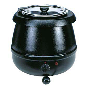 Мармит, электрический, настольный, для супов, круглая вставка (нерж.сталь) емкостью 10 л с крышкой (откидная съемная с фланцем), ручка термостата градуирована арабскими цифрами от 0 до 12, диапазон регулировки температуры 35-90 оС, способ наполнения водой: вручную, материал корпуса: эмалир. сталь.