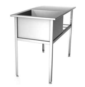 Ванна не имеет борта и отверстия под смеситель, а диаметр сливного отверстия составляет 50 мм. Толщина металла как ванны, так и рабочей поверхности составляет 0,8 мм, что гарантирует надежность конструкции. Каркас может быть выполнен из:
